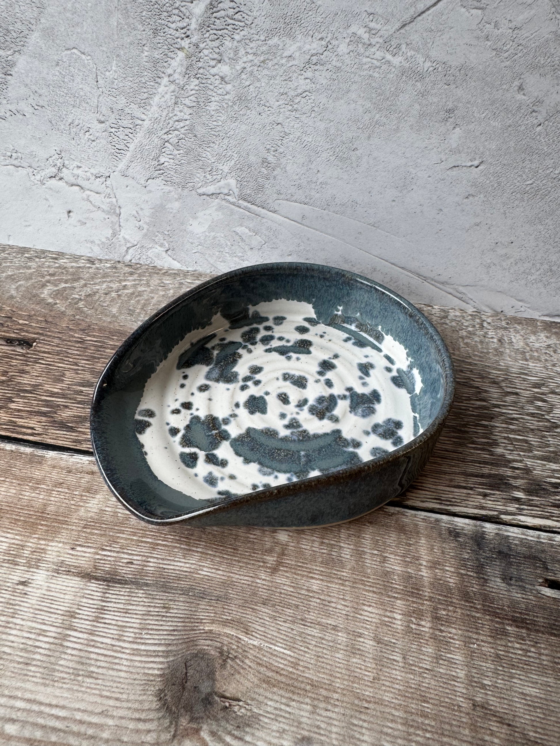 White stoneware wheelthrown spoonrest, finished in a gloss white glaze, with a blue splatter design